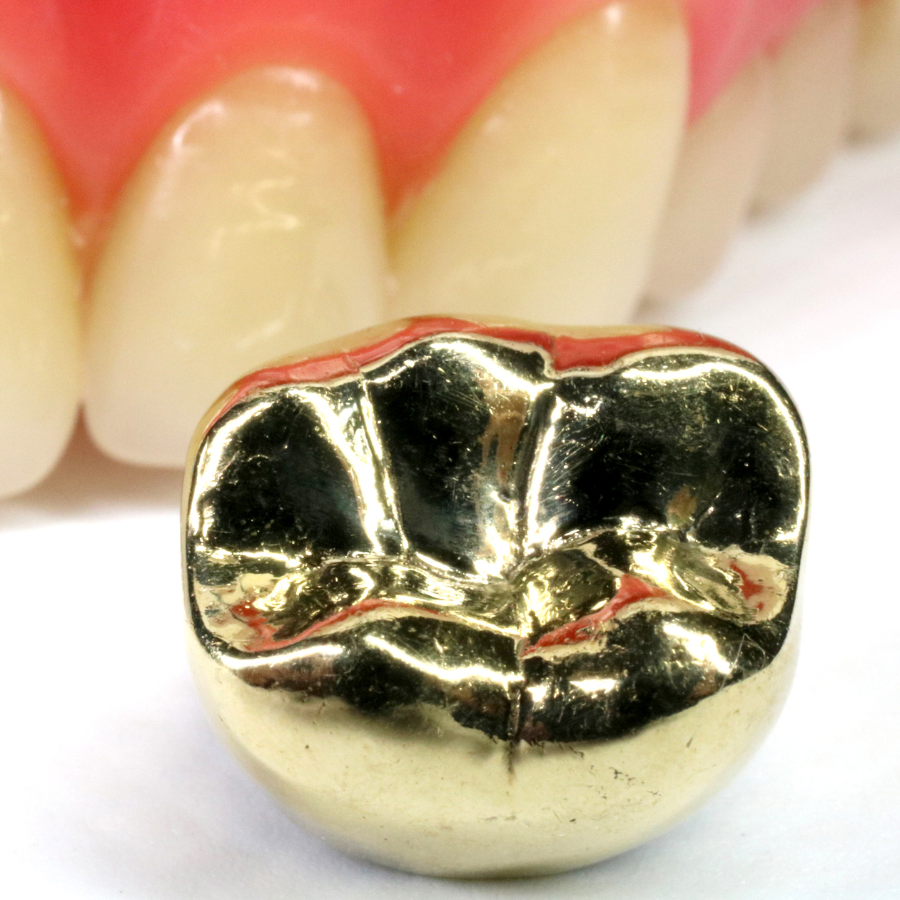 金を用いたインレー(詰め物)・クラウン(被せ物)です。強度があり、安定して使用できます。また歯との間に隙間ができにくく、汚れの侵入による虫歯の再発を防げます。
